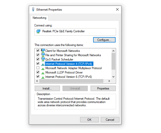 • Look for the Internet Protocol Version 4 (TCP/IPv4) setting options > Then click Properties as shown below.