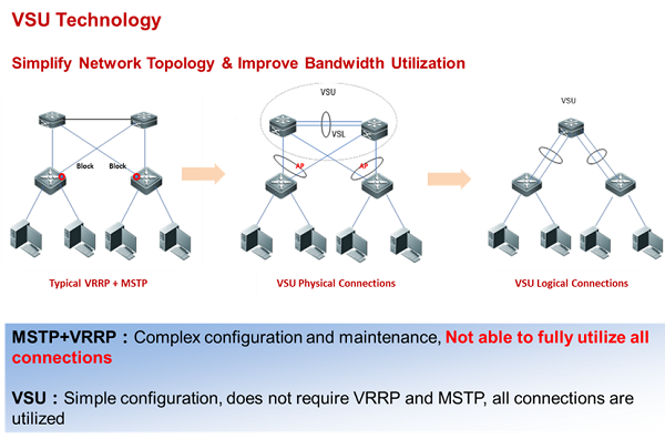 ● Simplified typology : VSU is considered a single switch on the network. With aggregation link connections and peripheral networking devices, the MSTP protocol is unnecessary because there is no Layer 2 loop network. All protocols operate as a single switch.