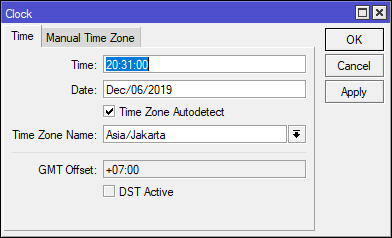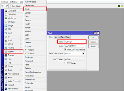 6. Kemudian kita akan melakukan cek waktu di dalam router Mikrotik sudah sama atau belum. Caranya yakni masuk ke System > Clock. Akan muncul tampilan seperti di bawah ini.